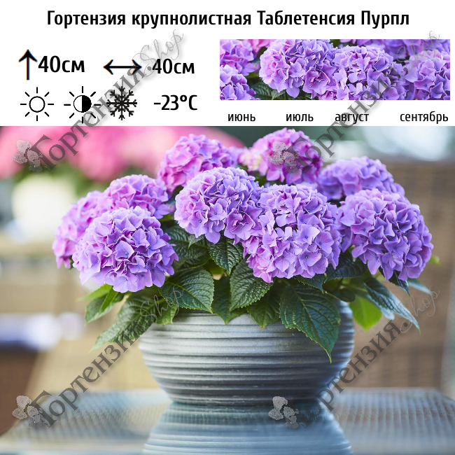Гортензия крупнолистная «Таблетенсия Пурпл» (Hydrangea macrophyllа «Tabletensia Purple»)  — это «сестра» сорта Pink, обладающая теми же уникальными суперкарликовыми характеристиками, но в другой цветовой гамме. Из-за своего богатого ветвления и богатого цветения, этот сорт выглядит как букет цветов. Высота куста 30- 40 см.В кислой почве цветки становятся ярко-фиолетовыми или сине-лиловыми. В нейтральной или слабощелочной почве они могут приобретать малиновые или розово-пурпурные тона. Зимостойкость низкая, требуется укрытие до наступления заморозков. Подходит для выращивания в вазонах, кашпо и контейнерах. При посадке лучше всего использовать специальную кислую почву или приготовить собственную почвосмесь из кислого торфа, плодородной почвы и речного песка. Требуется обильный полив. Для уменьшения испарения можно мульчировать сосновой корой или опилками хвойных пород. Предпочитает полутень. На открытом ярком солнце нежные листья и лепестки могут подгорать.