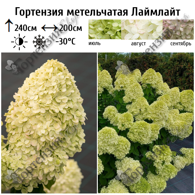 Гортензия метельчатая 'Лаймлайт' (Limelight) высотой до 2,4 м в высоту. Крона ветвистая, легко поддаётся формировке при обрезке. Стебли тёмно-коричневого окраса. Листва весной тёмно-зелёного оттенка. Листья густо расположены, прикрывают ветки плотной шапкой. Цветки среднего размера, ярко-зелёного оттенка. Постепенно становятся белыми, а к сентябрю принимают нежно-розовый окрас. Цветовая гамма также зависит от количества света. На участке с полутенью — оттенок зелёный, а на солнце — светло-зелёный, приближающийся к беловатому окрасу. Цветки соединены в большие соцветия в форме конуса до 25 см.