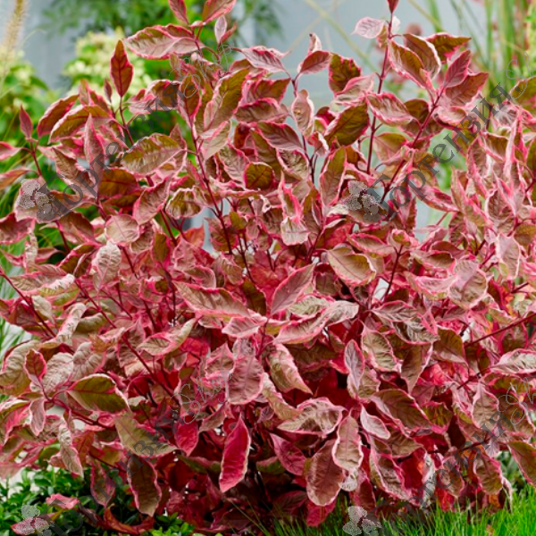 Дерен белый Миракл (Cornus alba Miracle) Сорт уникален своей неповторимой яркой расцветкой  весной, летом и осенью. Высота взрослого растения 170 см. Листья зеленые и белые с розовой каймой весной и в начале лета. С конца лета до осени листья приобретают интенсивно пурпурно-розовый окрас. Побеги красные. Осенний окрас алый с малиново-бордовым оттенком, что придает особый шарм в осеннем саду. Цветет  в мае - июне белыми цветами в зонтичных соцветиях позже созреают не съедобные белые плоды 5-7 мм. Сорт дерена Миракл  выдерживает яркое солнышко, так как в тени окрас будет не ярким. Нетребователен к почве, предпочитает влажную землю. Хорошо переносит щелочную почву. Зимостойкость - 34. Используют для  живой изгороди и в групповых  посадках.