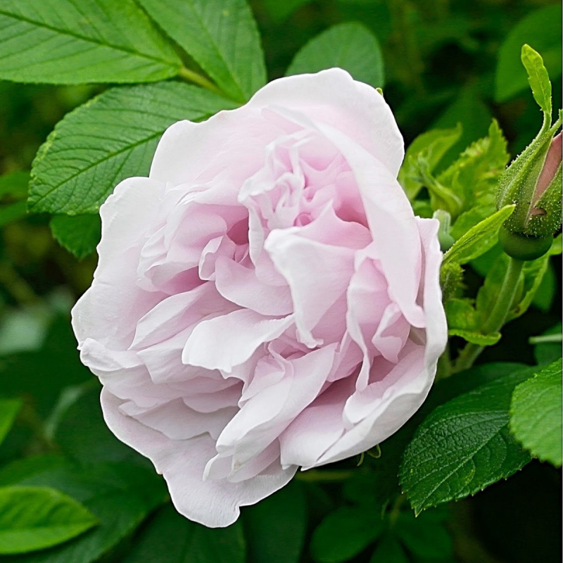 Куст раскидистый. Высота взрослого растения: 0,9-1 м. Диаметр кроны: 1-1,2м. Листья крупные, жесткие, морщинистые, зеленые, матовые. Цветки полумахровые, 6-7см в диаметре, белые с розовым или сиреневым оттенком, с приятным ароматом. Плоды  алые, крупные, мясистые, съедобные. Зимостойкость высокая. Цветение: обильное в июне, продолжается волнами до морозов. Светолюбива, выносит легкое затенение. Почвы предпочитает плодородные, дренированные, увлажненные.