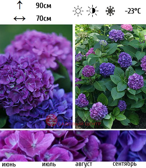 Выносливая и ремонтантная гортензия с сильными ветвями и красивыми туго набитыми цветами ярко-розовыми или сиреневыми, в шаровидных соцветиях. Соцветия-зонтики кружевные, асимметричной формы, диаметром до 20 см. Стерильные цветки полумахровые, розово-красные, в центре кремово-желтые. Соцветия в необычных оттенках от красного до темно-фиолетового цвета появляются на щелочных почвах, в то время как в оттенках синего цвета- на кислых. Цветет все лето, на прошлогодних и новых ветвях. Для поддержания декоративности необходимо удалять отцветшие соцветия. Высота и ширина куста: 80 и 100 см. Растения крепкие и компактные, цветочные шапки очень плотные, крупные. Куст пышный с крупными зелеными листьями высотой до 80 см. Морозостойкость высокая до -25°C. Однако требует укрытия на зиму, чтобы не замерзли почки цветов.