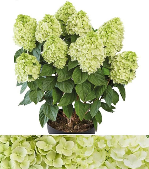 Гортензия метельчатая "Паненка" – эксклюзивная серия Патио немецкой селекции PAN. Шикарный, компактный сорт высотой до 70 см и диаметром 70 см, с эффектными, очень крупными и плотными шапками (до 30 см). Побеги у гортензии прочные, легко держат тяжелые, крупные соцветия. Соцветия вначале необычного оттенка – нефритово-зеленые, затем белые, и к концу цветения приобретают лаймовый оттенок. Имеет очень приятный, ванильный аромат. На солнечном участке или в легкой полутени цветение будет пышнее и ярче. Цветет с июня и до заморозков. Сорт зимостоек, неприхотлив. Благодаря своему компактному росту, гортензии этой серии хорошо смотрятся в низких садовых бордюрах, и очень декоративны в кашпо.